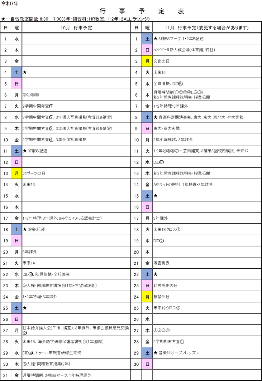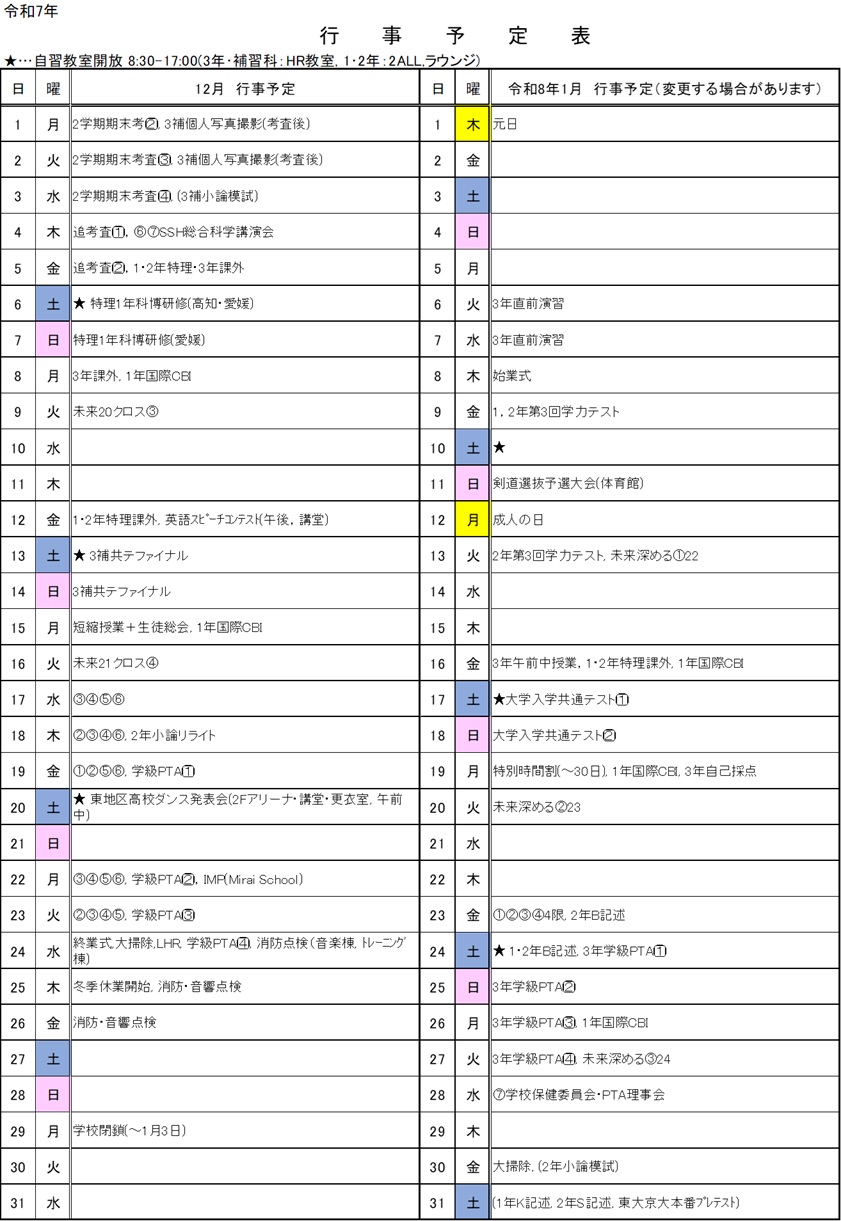 ※月曜日と金曜日は6校時までです。6,7校時後15分間清掃を行います。