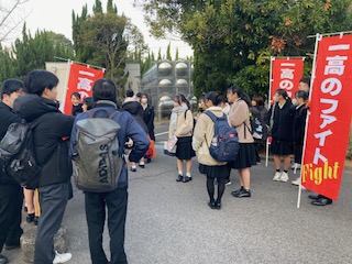 これからが本番 1月17日(土)、18日(日)の二日間、大学入学共通テストが行われ、本校からも多くの3年生及び卒業生が受験しました。写真は、初日朝の本校教員による激励の様子です。 本日の自己採点を経て、受験校を決定します。最後まで駆け抜けましょうね。